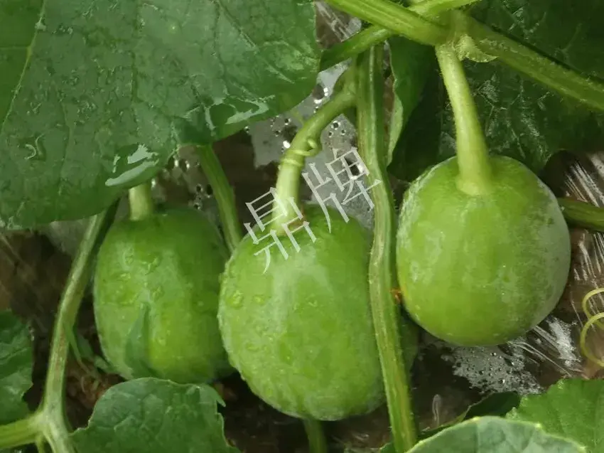 早熟,果皮呈流金溢彩,果肉乳白,單果重800g左右,口感特別甜脆。因果皮脆嫩,適宜包裝網(wǎng)袋后運輸,產(chǎn)品定位為高端市場??鼓嫘詮?,遇上暴雨不易裂瓜,大棚或露地、吊蔓或爬地都能獲得豐產(chǎn)。