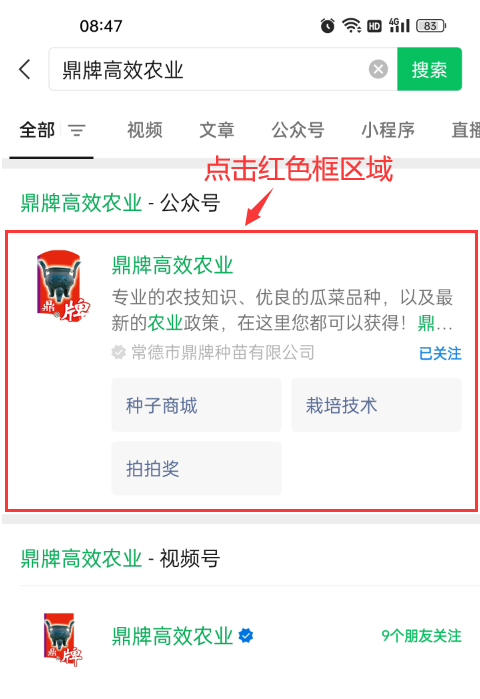 3、點(diǎn)擊紅色框區(qū)域的“鼎牌高效農(nóng)業(yè)”公眾號信息,進(jìn)入詳細(xì)頁面。